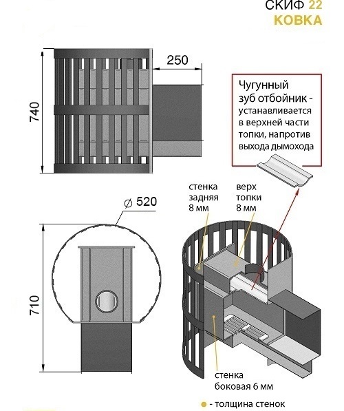 Печь - сетка Скиф-22 ВК (К) спроектирована по принципу вентилируемой открытой каменки. Открытая каменка, как следует из названия, делается таким образом, чтобы к камням был открытый доступ из парной (в отличие от закрытых каменок, когда камни располагаются внутри печи) и прямо на них можно было плеснуть воду из ковша для получения пара. Такая система помогает быстро получить оптимальное количество качественного легкого сухого пара, поскольку избыток воды сливается на пол через камни и не участвует в процессе парообразования.