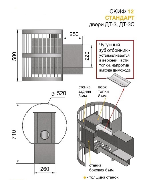 Банная печь Скиф ВЧ укомплектована топочной глухой чугунной дверцей и имеет конвекционно-вентилируемый кожух (сетка), который изготовлен из калиброванного прута диаметром 6 мм. Дровяная печь Везувий Скиф 12 ВЧ рассчитана на объем парильного помещения 6-14 м3. В конструкции данной печи предусмотрен топочный тоннель длиной 250 мм, при помощи которого печь топится из соседнего помещения, смежного с парильным. Банная печь Скиф 12 ВЧ (Ч) относится к так называемым печам – сеткам. По всей поверхности теплообменника в сетку закладываются камни, которые образуют своеобразный каменный конвектор, защищающий от слишком интенсивного инфракрасного излучения нагретых частей печи и одновременно, благодаря возникающей конвекции через зазоры между камнями, очень эффективно обогревающий парную. Большая масса камней накапливает тепло и создает мягкое и комфортное излучение, как будто печь сложена из кирпича.