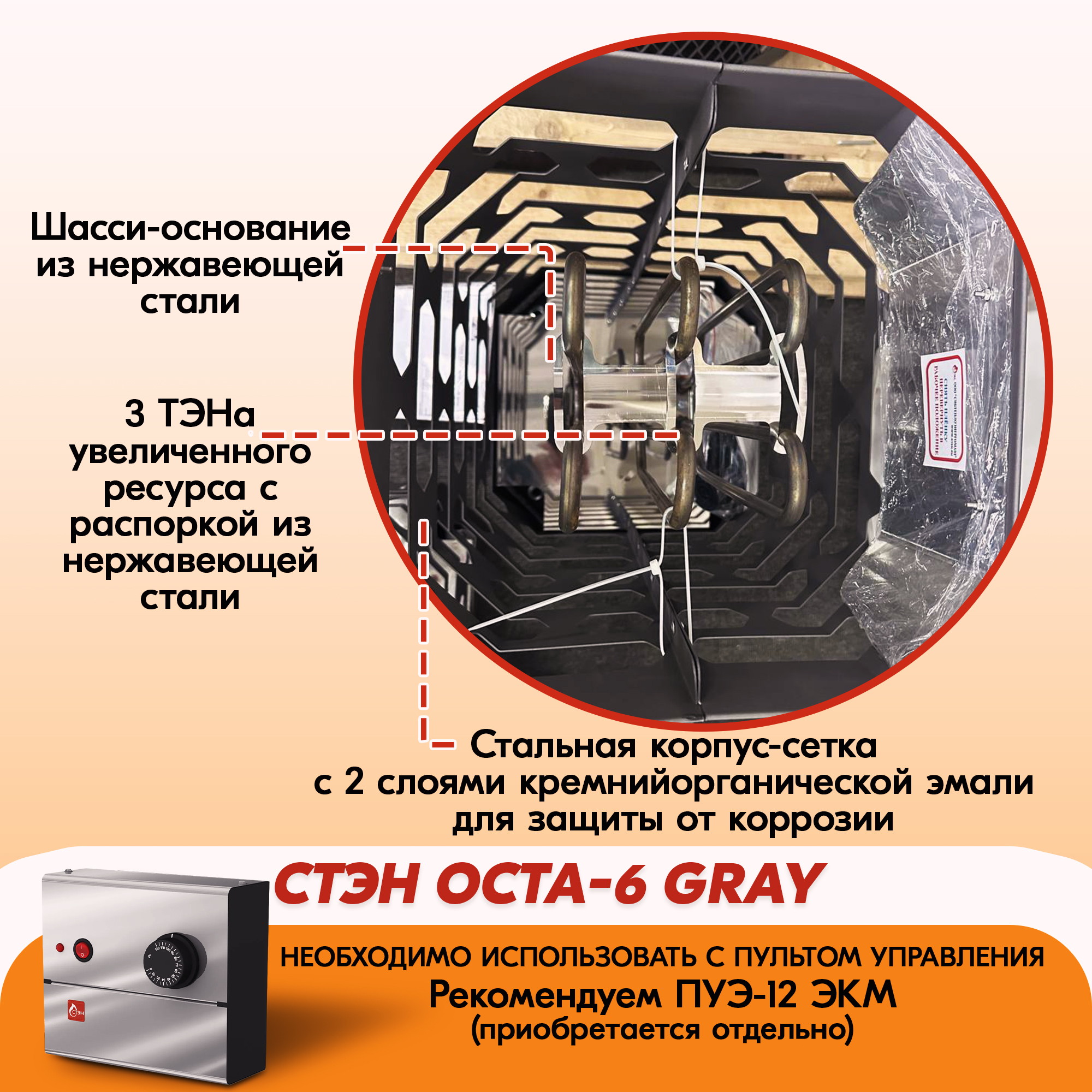 Съёмный корпус-сетка электрокаменки с индексом gray окрашен двумя слоями кремнийорганической эмали.