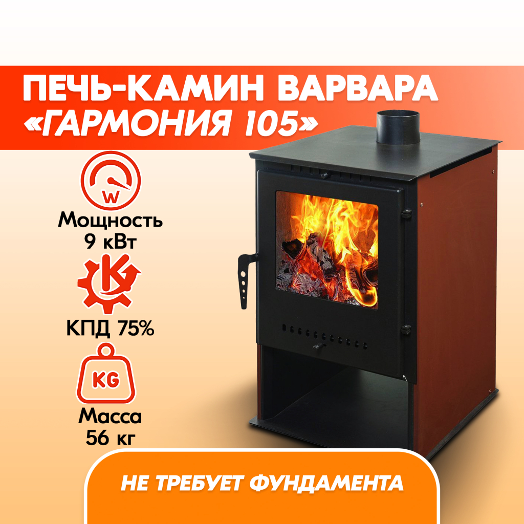 Компактная и легкая печка «Гармония 105» обладает высоким КПД в 75%, проста в эксплуатации и станет незаменимым элементом для отопления вашего загородного дома или дачи, при этом тепло в вашем доме не будет зависеть от перебоев электричества.