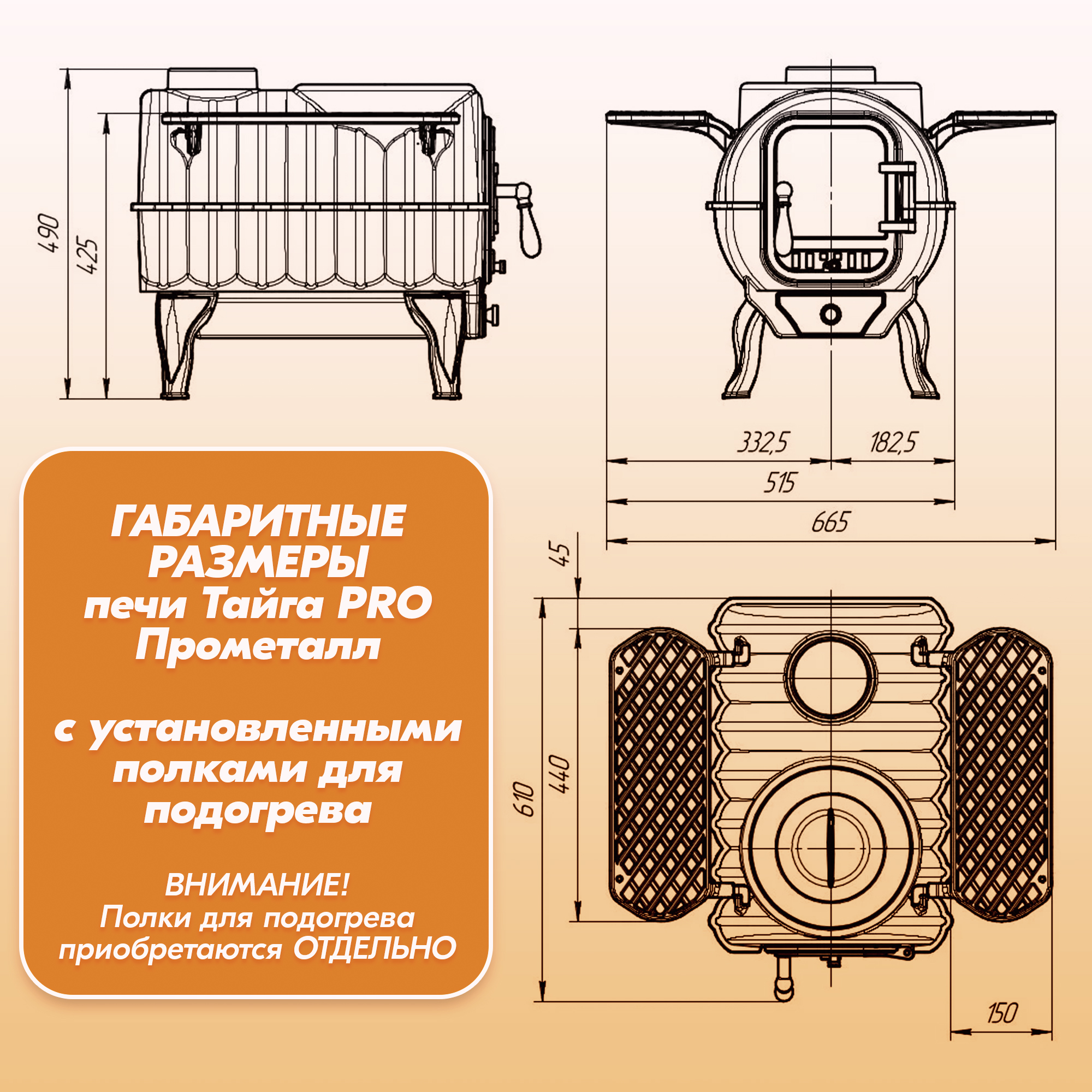 Для увеличения функциональности отопительно-варочной печи для дачи вы можете ДОПОЛНИТЕЛЬНО приобрести специальные полки для подогрева.