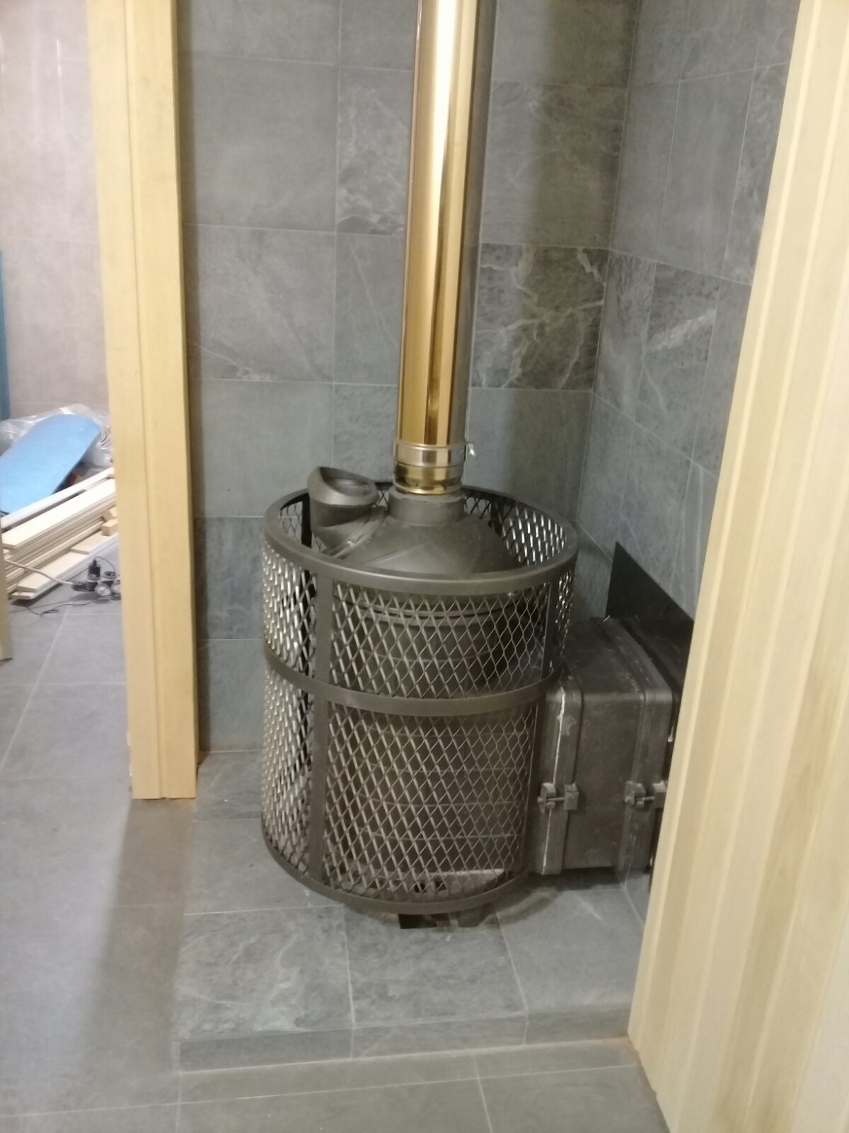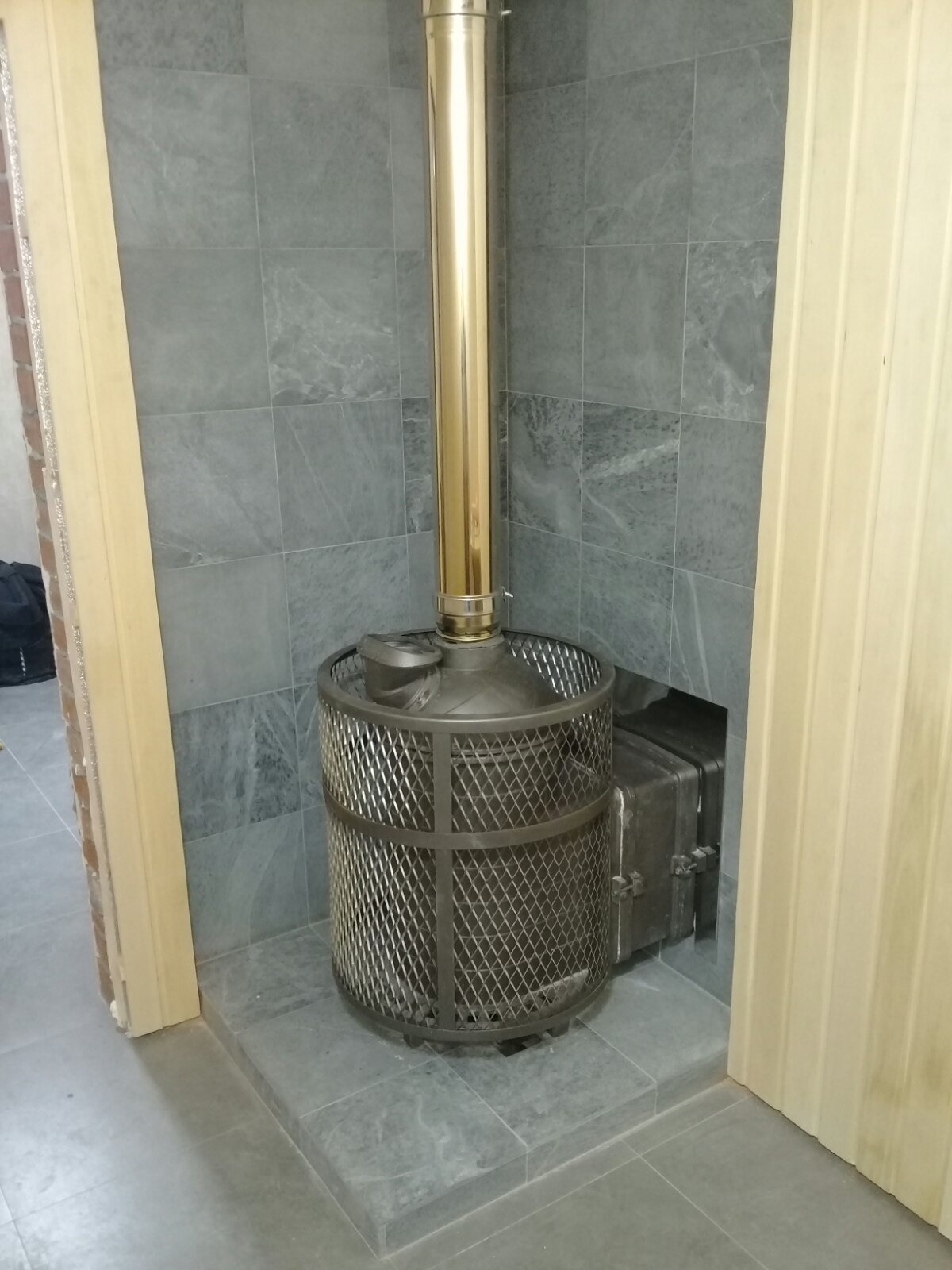 Монтаж банной печи Атмосфера с облицовкой портала камнем